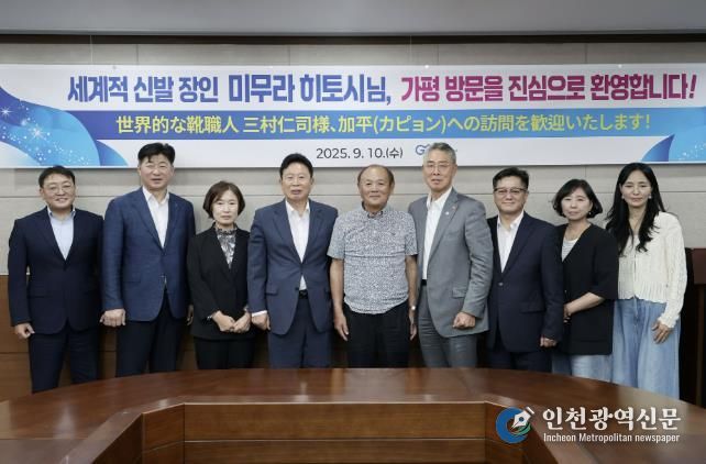 [인천광역신문] 관리자 기자 | 가평군은 10일 세계적인 신발 장인으로 알려진 미무라 히토시(사진 왼쪽부터 다섯번째)가 가평군청을 방문해 서태원 군수(〃 네번째)와 환담을 나눴다고 밝혔다. 이번 만남은 가평군의 대표 행사인 ‘가평 자라섬 전국마라톤대회’의 활성화와 지역 학생 육상부 육성을 주제로 심도 깊은 논의를 위해 마련됐다.