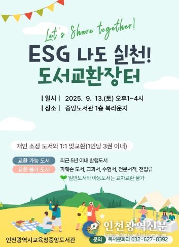 [인천광역신문] 최예준 기자 | 인천광역시교육청중앙도서관은 환경친화적 독서 문화 조성과 지역사회 나눔 실천을 위해 9월 13일 오후 1시부터 4시까지 중앙도서관 1층 북라운지에서 ‘ESG 실천 도서교환장터’를 개최한다.