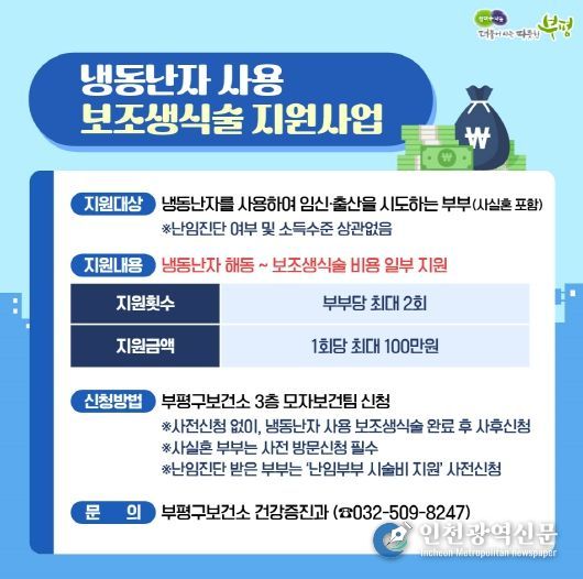 [인천광역신문] 최예준 기자 | 부평구는 아이를 원하는 부부의 임신·출산을 적극적으로 지원하기 위해 ‘냉동 난자 사용 보조생식술 지원사업’을 진행한다고 12일 밝혔다.