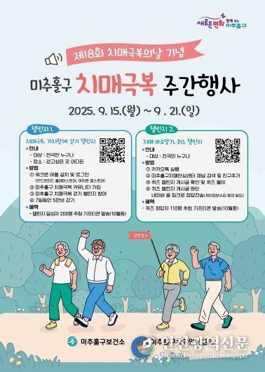 [인천광역신문] 최예준 기자 | 미추홀구 치매안심센터(센터장 차남희)는 제18회 치매 극복의 날을 맞아 오는 15일부터 7일간 ‘치매 극복 주간 행사’를 진행한다.