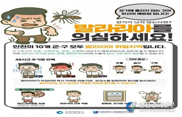신병철 시 보건복지국장은 “인천 10개 군·구 전역이 모두 말라리아 위험지역인 만큼 각별한 주의가 필요하다”며 “야간 야외활동 자제, 밝은 색의 긴 옷 착용 및 모기기피제 사용 등 예방수칙을 지켜달라”라고 당부했다.