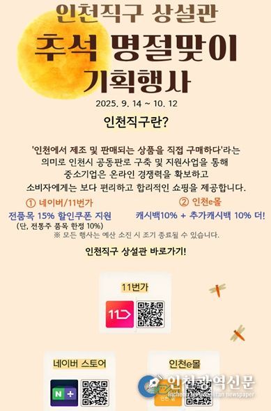 [인천광역신문] 최예준 기자 | 인천광역시는 추석 명절을 맞아 지역 중소기업의 온라인 판로 확대와 지역상품 소비 촉진을 위한 공동 온라인 판로 ‘인천직구’ 특별기획전을 개최한다고 밝혔다.