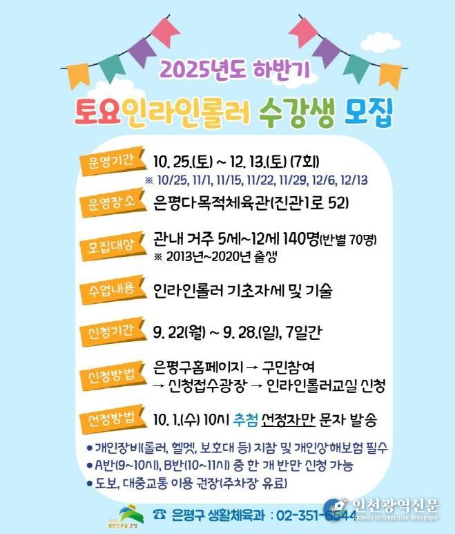 [인천광역신문] 최훈 기자 | 서울 은평구는 관내 어린이의 생활체육능력 향상을 위한 ‘하반기 토요 인라인롤러 교실’ 참여자를 오는 22일부터 28일까지 모집한다고 밝혔다.