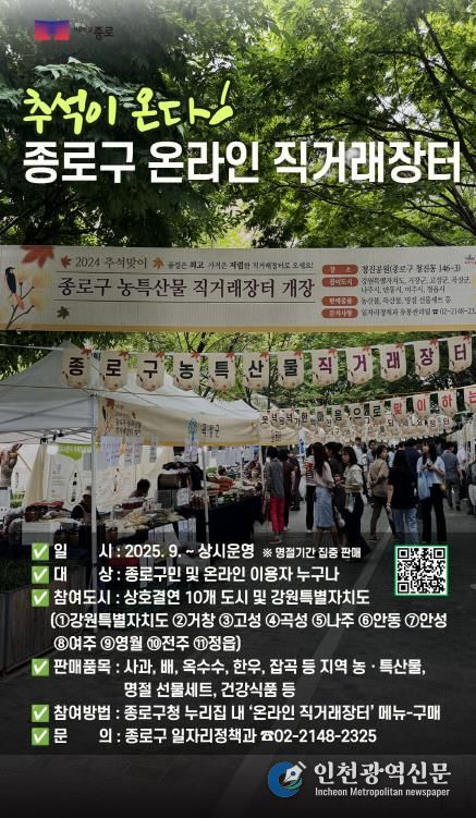 [인천광역신문] 최훈 기자 | 종로구는 민족 최대 명절 추석을 맞아 구민들의 명절 준비 부담을 덜고, 지역 소상공인들의 매출 증대를 지원하기 위해 ‘종로사랑상품권’을 발행하고 온라인 직거래 장터를 운영한다.