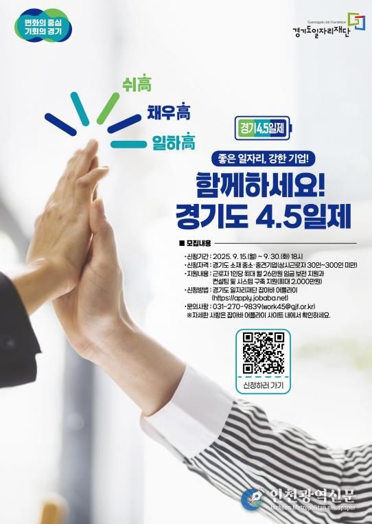 [인천광역신문] 관리자 기자 | 경기도와 경기도일자리재단은 노동자의 일·생활 균형과 노동환경 개선을 통한 생산성 향상을 위해 15일부터 30일까지 ‘2025년 경기도 4.5일제 시범사업’ 참여 기업 3차 추가 모집을 한다.
