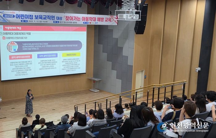 [인천광역신문] 최예준 기자 | 인천시 중구는 지난 12일 중구청소년수련관에서 관내 어린이집 보육 교직원을 대상으로 ‘찾아가는 아동학대 예방 교육’을 진행했다.