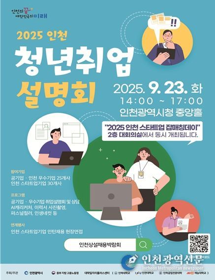 [인천광역신문] 최예준 기자 | 인천광역시는 오는 9월 23일 시청 중앙홀에서 ‘2025 인천 청년 취업설명회’를 개최한다고 밝혔다. 이번 행사는 청년들에게 공기업·민간기업·신생기업(startup) 등 다양한 취업 기회를 제공하기 위해 마련됐다.