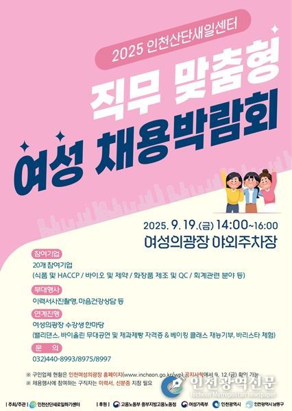 [인천광역신문] 최예준 기자 | 인천광역시 여성의광장 인천산단여성새로일하기센터는 오는 9월 19일 오후 1시부터 여성의광장 야외광장에서 ‘2025 인천산단새일센터 직무 맞춤형 여성 채용박람회’를 개최한다고 밝혔다.