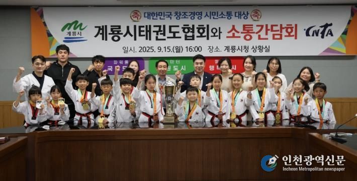 [인천광역신문] 관리자 기자 | 계룡시는 15일 제10회 대전MBC 계룡국제오픈태권도대회에서 뛰어난 성과를 거둔 관내 태권도 선수단과 관계자들을 초청해 격려하는 자리를 가졌다.