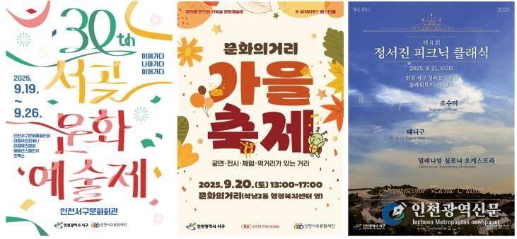 [인천광역신문] 최예준 기자 | 인천 서구는 제37회 구민의 날 행사와 함께 서구문화재단이 준비한 3개 문화축제가 9월 19일부터 21일까지 개최된다고 16일 밝혔다.