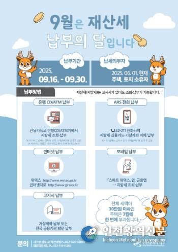 재산세의 납부 기한은 9월 30일이며, 고지서 없이 ▲ATM기기에 납세의무자 본인의 통장이나 카드를 넣으면 재산세를 조회하여 바로 납부할 수 있고, ▲가상계좌이체 ▲위택스·인터넷지로 ▲ARS카드납부 등 편리한 납부 방법을 제공하고 있다.