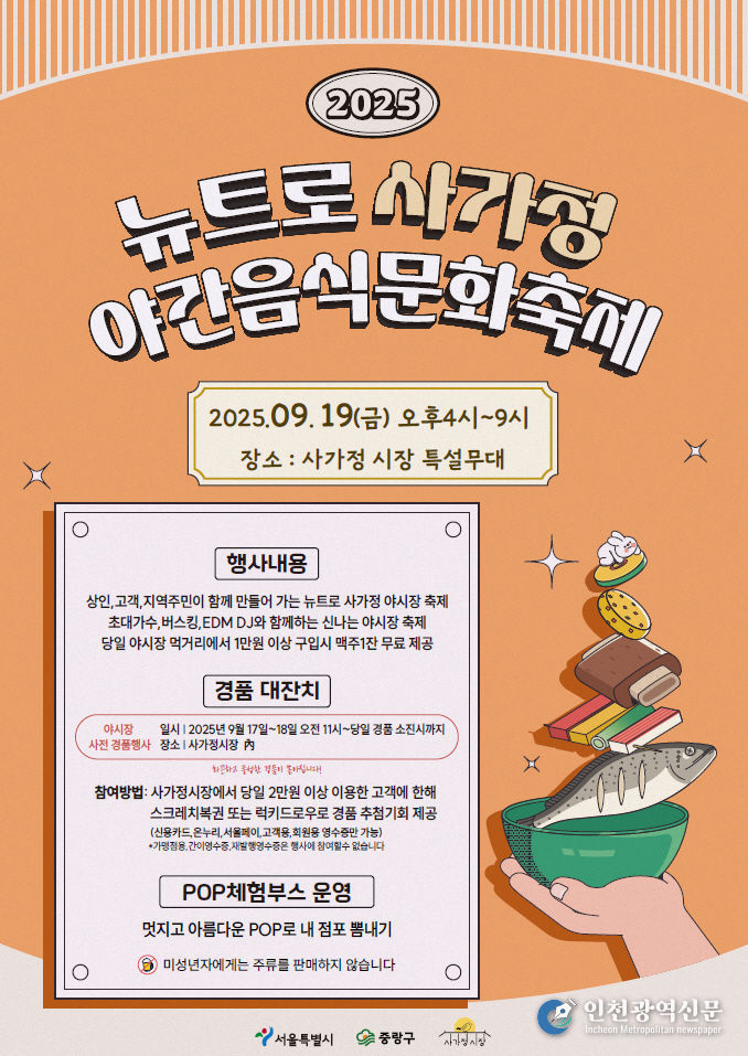 [인천광역신문] 관리자 기자 | 서울 중랑구의 대표 전통시장인 사가정시장이 9월 19일(목) 오후 4시부터 9시까지 ‘뉴트로 사가정 야간음식문화축제’를 개최한다. 이번 축제는 사가정시장이 주최하고 서울시와 중랑구청이 후원하며 (주)시장통이 수행기관으로 참여한다.