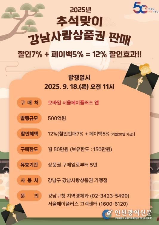 [인천광역신문] 최훈 기자 | 꿈이 모이는 도시, 미래를 그리는 강남구가 9월 18일 오전 11시 서울시 최대 규모인 500억 원의 ‘강남사랑상품권’을 발행해 추석 민생경제 지원에 나선다.