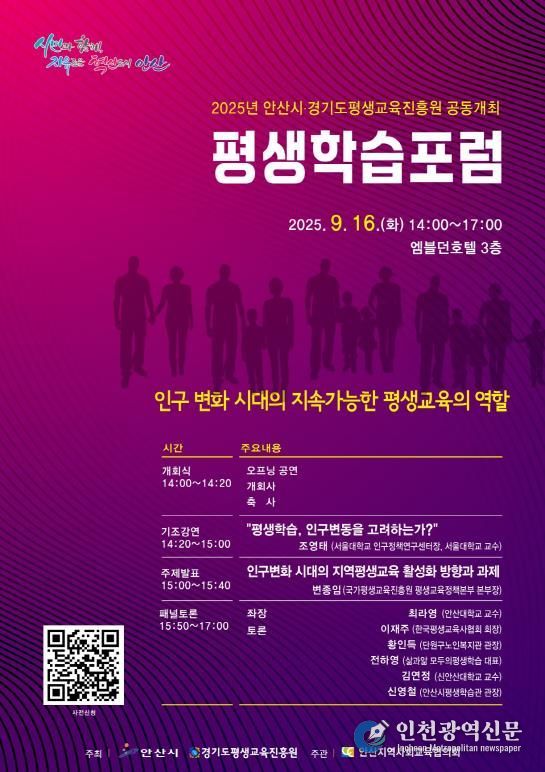 [인천광역신문] 관리자 기자 | 경기도평생교육진흥원은 16일 안산 엠블던호텔에서 안산시와 공동으로 ‘인구 변화 시대의 지속가능한 평생교육의 역할’을 주제로 평생학습포럼을 열었다.