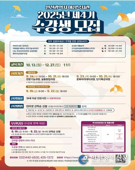 [인천광역신문] 최예준 기자 | 인천광역시 여성복지관은 오는 9월 19일부터 ‘2025년도 제4기 사회교육강좌’ 수강생을 모집한다고 밝혔다.