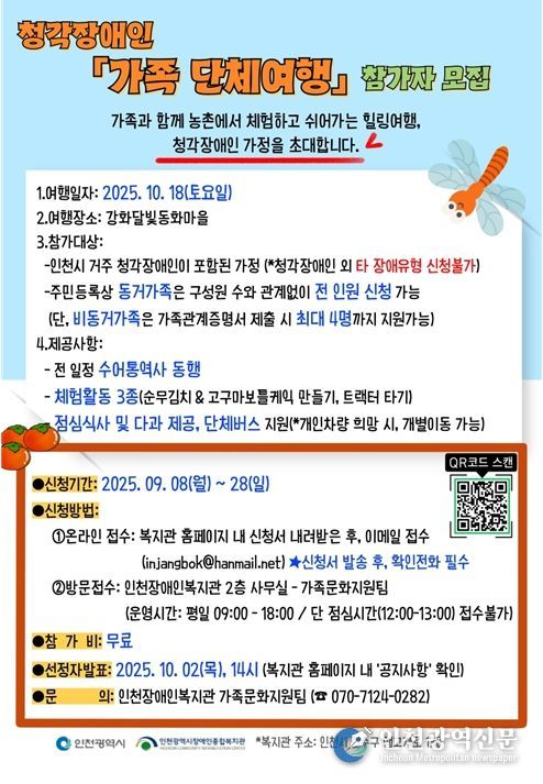 [인천광역신문] 최예준 기자 | 인천시사회서비스원 소속 인천장애인종합복지관은 청각장애인 가족 단체여행 참가자를 모집한다고 17일 밝혔다.
