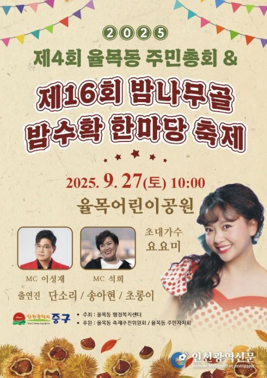 [인천광역신문] 최예준 기자 | 인천시 중구 율목동 행정복지센터는 오는 27일 율목어린이공원에서 ‘제4회 율목동 주민총회 및 제16회 밤나무골 밤 수확 한마당 축제’를 개최한다고 밝혔다.