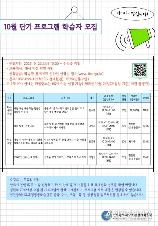 [인천광역신문] 최예준 기자 | 인천광역시교육청평생학습관은 10월 15일부터 19세 이상인천 시민을 대상으로 ESG 생태환경과 인문교양을 주제로 단기 프로그램을 운영한다.