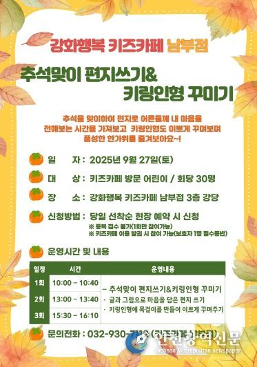 [인천광역신문] 최예준 기자 | 강화군시설관리공단(이사장 박영길) 강화행복 키즈카페 남부점에서 오는 27일, 추석을 맞아 ‘추석맞이 편지쓰기&키링인형 꾸미기’ 프로그램을 운영한다.