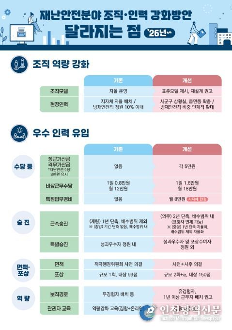 [인천광역신문] 관리자 기자 | 국민의 생명과 안전을 지키는 재난·안전 담당 공무원들이 받는 수당이 확대되고, 그들에 대한 승진 혜택도 강화된다.