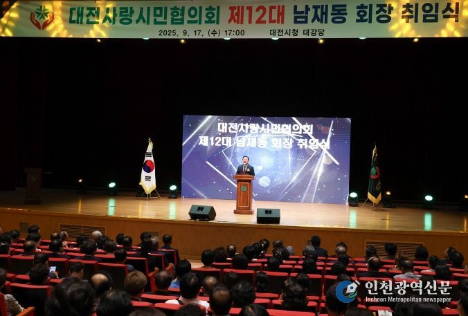 [인천광역신문] 관리자 기자 | 대전시는 9월 17일 시청 대강당에서 열린 ‘제12대 대전사랑시민협의회 회장 취임식’에 이장우 시장이 참석해 남재동 신임 회장의 취임을 축하하고, 협의회와 함께 일류도시 대전 건설에 박차를 가할 뜻을 밝혔다. 이번 행사에는 조원휘 시의장, 유관기관장, 회원단체 대표 등 400여 명이 함께해 협의회의 새로운 출발을 응원했다.