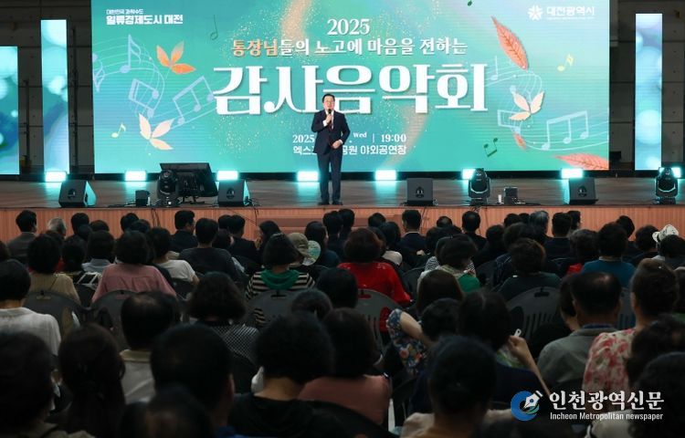 [인천광역신문] 관리자 기자 | 대전시는 9월 17일 오후 7시 엑스포시민광장 야외공연장에서 5개 구 2,600여 명의 통장들을 초청해 감사음악회를 개최했다. 이번 행사는 주민등록 사실조사, 복지 사각지대 발굴, 대전 0시 축제, 봉사활동 등 지역 곳곳에서 묵묵히 헌신해 온 통장들에게 감사의 마음을 전하기 위해 마련됐다.