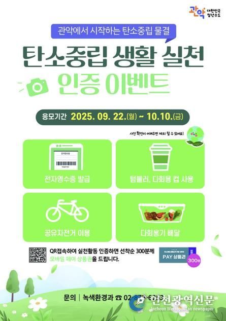 [인천광역신문] 최훈 기자 | 관악구가 기후위기 대응과 탄소중립 실천 문화 확산을 위해 ‘탄소중립 녹색생활 실천 인증 이벤트’를 진행한다.
