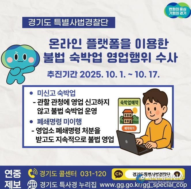 [인천광역신문] 관리자 기자 | 경기도가 10월 1일부터 17일까지 3주간 온라인 공유 숙박 플랫폼을 이용해 오피스텔 등에서 불법 숙박업을 운영하는 미신고 업소를 집중 단속한다.