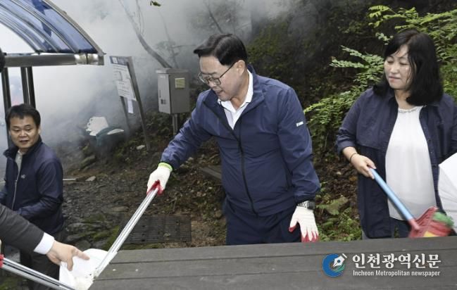 18일 회암사 약수터에서는 강수현 시장과 도시환경사업소장 등 관계자들이 참여해 낙엽과 쓰레기 등 오염원을 제거하고, 취수구 소독·방역 및 주변 시설 점검을 실시했다.