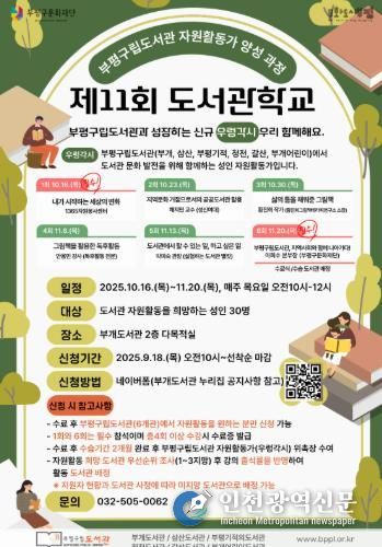 [인천광역신문] 최예준 기자 | 부평구 구립 부개도서관은 18일부터 2025년 부평구립도서관 자원활동가 양성 과정 ‘제11회 도서관학교’ 참가자를 모집한다.