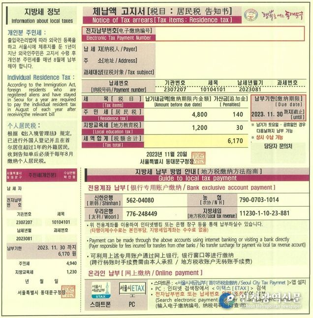 이에 동대문구는 한국어와 함께 영어·중국어를 병기한 체납 안내문을 제작했다. 안내문 앞면은 기존 체납고지서 형식을 유지하면서 주요 은행(신한·우리·농협) 전용계좌를 명시해 납부 편의를 높였다. 뒷면에는 체납 시 불이익 내용을 한국어·영어·중국어·베트남어 4개 언어로 안내해 외국인도 쉽게 이해할 수 있도록 했다.