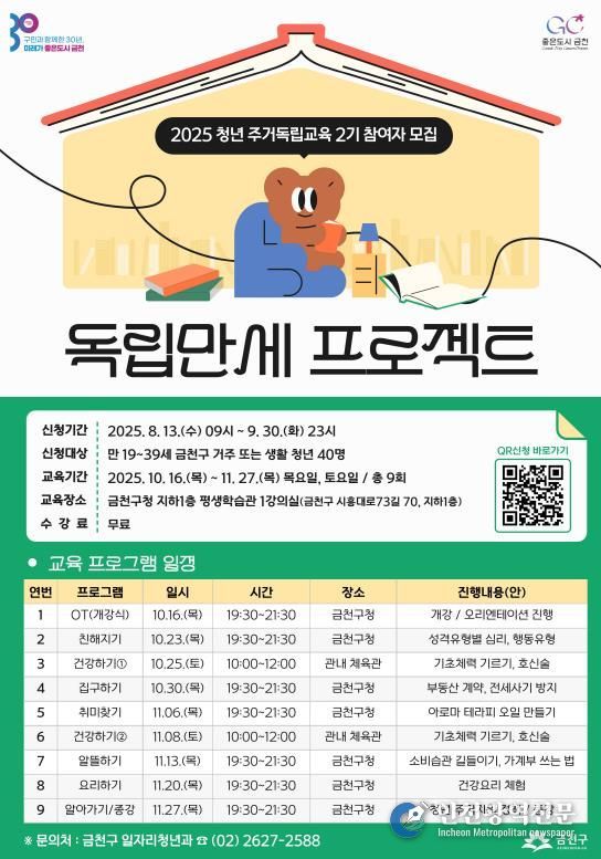 [인천광역신문] 최훈 기자 | 금천구는 청년들의 실질적인 주거 자립생활을 지원하는 교육 프로그램 ‘독립만세 프로젝트’ 2기 참여자를 30일까지 모집한다고 밝혔다.