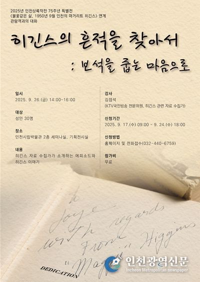 [인천광역신문] 최예준 기자 | 인천광역시 시립박물관은 9월 26일‘불꽃같은 삶: 1950년 9월 인천의 마거리트 히긴스’ 특별전과 연계해 ‘관람객과의 대화’ 행사를 개최한다고 밝혔다.