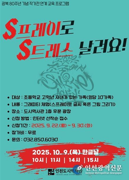 [인천광역신문] 최예준 기자 | 인천광역시 인천도시역사관은 광복 80주년 기념 작가전의 연계행사인 ‘스(S)프레이로 스(S)트레스를 날려요’를 10월 9일 한글날에 맞춰 운영한다고 밝혔다.