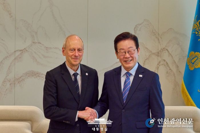 [인천광역신문] 관리자 기자 | 이재명 대통령은 오늘 오후 집무실에서 '정의란 무엇인가'의 저자인 마이클 샌델 미국 하버드대 교수를 접견했다.