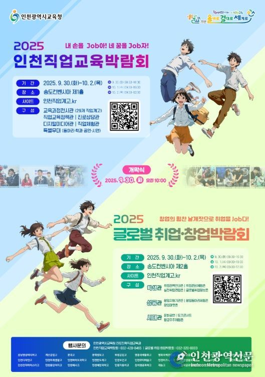 [인천광역신문] 최예준 기자 | 인천광역시교육청은 9월 30일부터 10월 2일까지 3일간 송도컨벤시아에서 ‘2025 인천직업교육박람회’와 ‘2025 글로벌 취업·창업박람회’를 동시 개최한다고 19일 밝혔다.