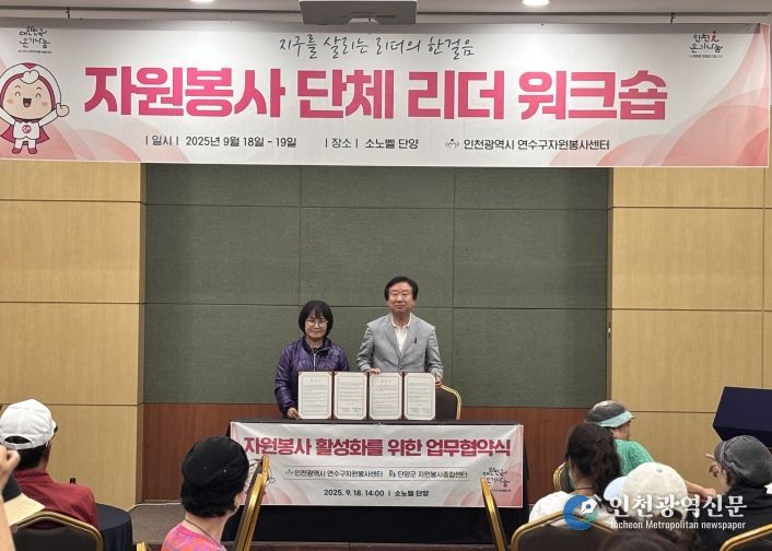 [인천광역신문] 최예준 기자 | 인천광역시 연수구자원봉사센터와 충청북도 단양군자원봉사종합센터는 18일 (단양소노벨)에서 지역간 자원봉사 활성화와 네트워크를 통해 지역사회 발전을 위한 업무협약(MOU)을 체결했다고 밝혔다.