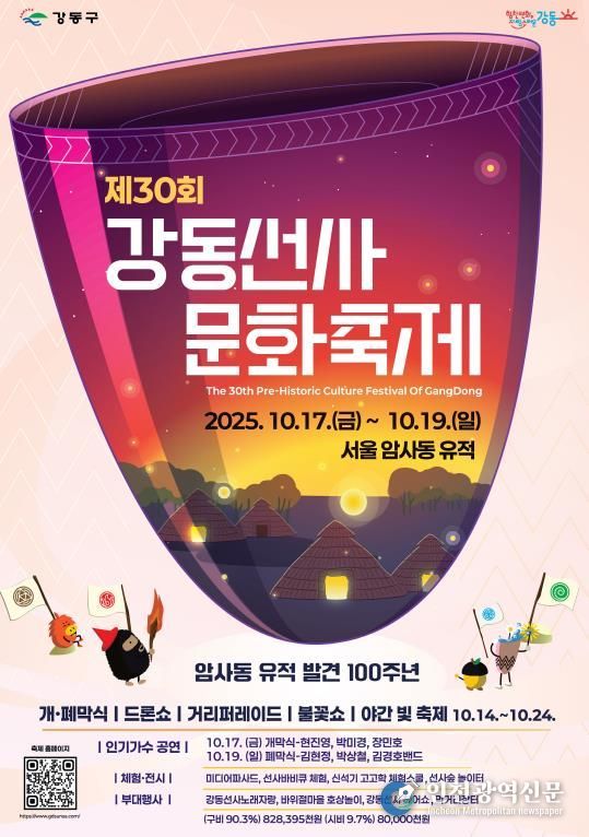 [인천광역신문] 최훈 기자 | 가을 나들이의 계절, 강동구에서 6천 년 전 선사시대로의 특별한 시간여행이 펼쳐진다. 서울 동남권을 대표하는 인기 축제인 ‘강동선사문화축제’는 매년 수십만 명의 방문객들이 찾는 강동구의 대표 문화행사로, 선사시대의 숨결을 오늘에 되살리는 체험의 장이다. 특히, 올해는 30회를 맞아 한층 다채로운 프로그램을 마련해 역사와 문화가 어우러진 가을 축제의 진수를 선보일 예정이다.