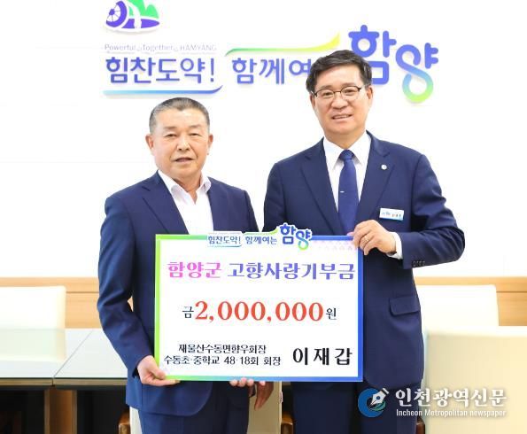 [인천광역신문] 관리자 기자 | 함양군은 지난 21일 이재갑 재울산수동면향우회장(수동초 제48회·수동중 제18회 회장)이 고향 함양을 방문해 고향사랑기부금 200만 원을 전달했다고 22일 밝혔다.