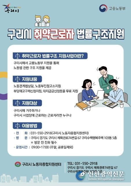 [인천광역신문] 관리자 기자 | 구리시는 최근 경기 불황으로 임금체불 문제가 사회적 이슈로 드러남에 따라 '2025년 노동 약자 일터 개선 사업'의 일환으로 노동 약자 법률구조 사업을 오는 9월 22일부터 확대 시행한다고 밝혔다.