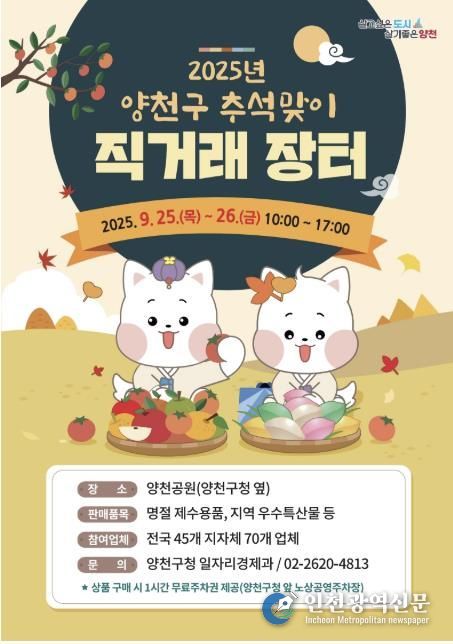 [인천광역신문] 최훈 기자 | 양천구는 민족 최대 명절인 추석을 앞두고, 오는 9월 25일과 26일 양일간 양천공원에서 ‘2025년 추석맞이 직거래 장터’를 운영한다고 밝혔다.