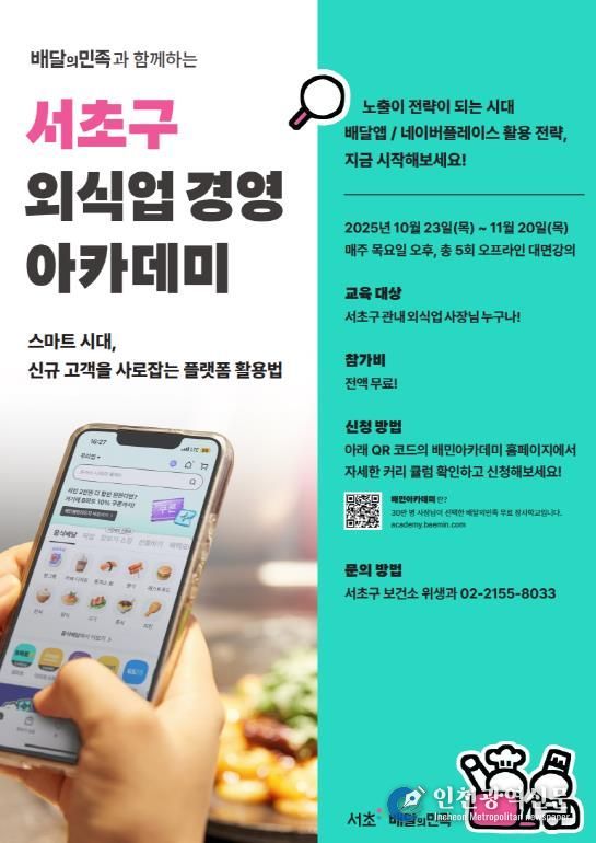 [인천광역신문] 최훈 기자 | 서울 서초구는 9월 24일부터 10월 20일까지 외식업 경영자들의 외식산업 경쟁력 강화와 지역상권 활성화를 위해 ‘제7기 서초구 외식업 경영 아카데미’ 수강생을 모집한다고 밝혔다.
