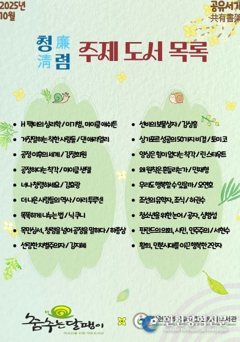 [인천광역신문] 최예준 기자 | 인천광역시교육청 신트리도서관은 10월 1일부터 31일까지 부평구 작은도서관 ‘춤추는달팽이도서관’과 함께 청렴을 주제로 공유서가를 운영한다.