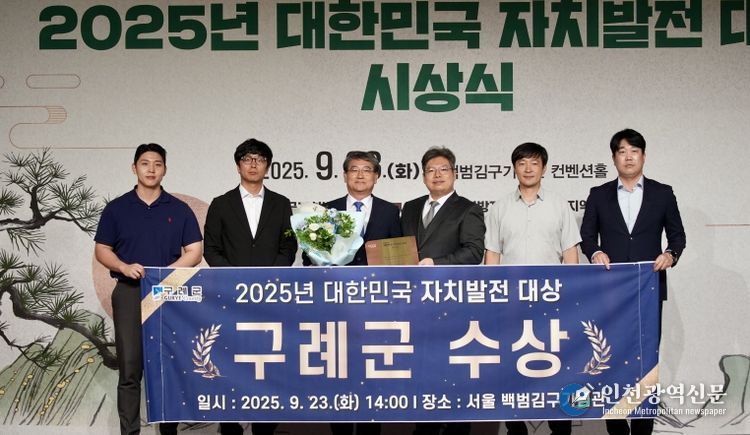[인천광역신문] 관리자 기자 | 전남 구례군은 9월 23일 서울 백범김구기념관에서 열린 ‘2025년 대한민국 자치발전 대상’ 시상식에서 기초자치단체 부문 대상을 수상하는 영예를 안았다. 전남 지자체 중에서는 구례군이 유일하게 수상했다.