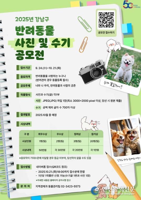 [인천광역신문] 최훈 기자 | 꿈이 모이는 도시, 미래를 그리는 강남구가 오는 9월 24일부터 10월 21일까지 ‘반려동물 사진 및 수기 공모전’을 개최한다. 이번 공모전은 반려동물과 함께한 일상을 기록한 사진과 수기를 접수받아 총상금 190만 원 규모로 시상할 예정이다.