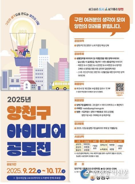 [인천광역신문] 최훈 기자 | 양천구가 구민의 창의적이고 혁신적인 생각을 정책에 반영하기 위해 ‘2025년 양천구 아이디어 공모전’을 10월 17일까지 개최한다.