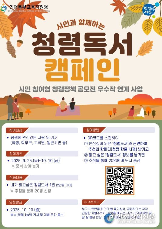 [인천광역신문] 최예준 기자 | 인천북부교육지원청은 교직원·학생·학부모·시민 누구나 쉽게 참여할 수 있는 ‘청렴독서 캠페인’을 9월 25일부터 10월 10일까지 운영한다고 밝혔다.