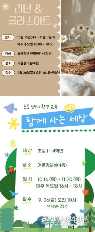 [인천광역신문] 최예준 기자 | 인천광역시교육청신트리도서관은 9월 26일부터 ‘2025년도 하반기 초등 마을교육 프로그램’ 참가자를 모집한다.