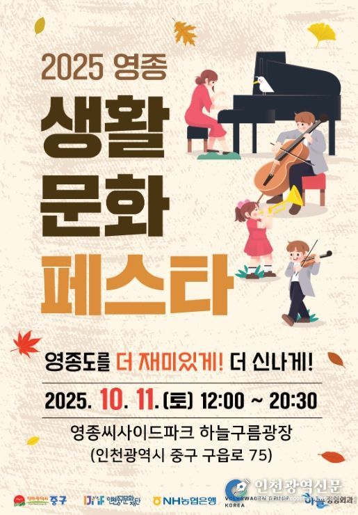 [인천광역신문] 최예준 기자 | (재)인천중구문화재단은 오는 10월 11일 영종씨사이드파크 하늘구름광장(인천 중구 구읍로 75)에서 ‘2025 영종 생활문화 페스타’를 개최한다고 밝혔다.