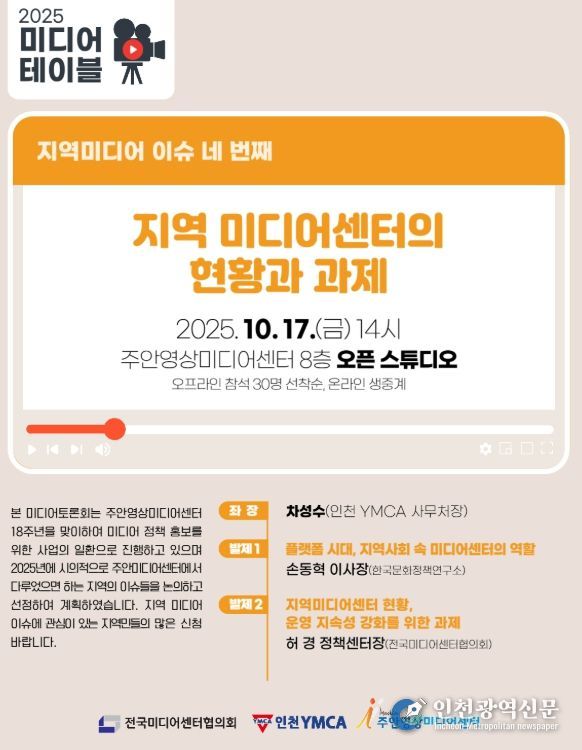 [인천광역신문] 최예준 기자 | 인천 미추홀구 주안영상미디어센터는 오는 10월 17일 오후 2시 센터 오픈 스튜디오에서 ‘미디어 테이블: 지역 미디어센터의 현황과 과제’ 토론회를 개최한다.